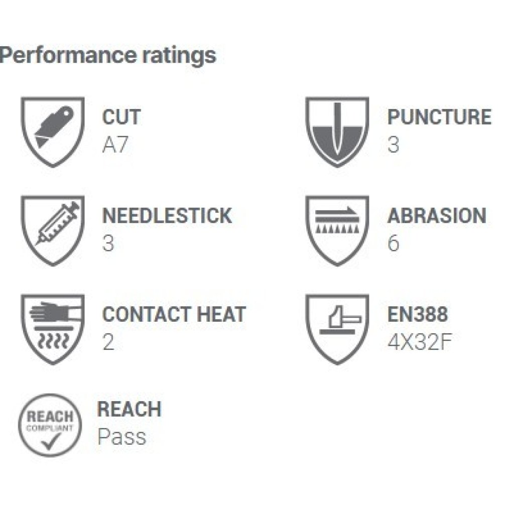 - Highest needlestick and cut resistance available on noted enhanced areas, with cut A7 and needlestick level 3 at the fingertips