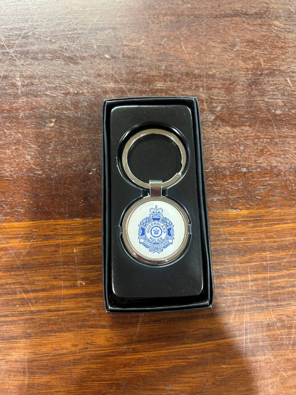 QPS White/Navy Round Metal Keyring