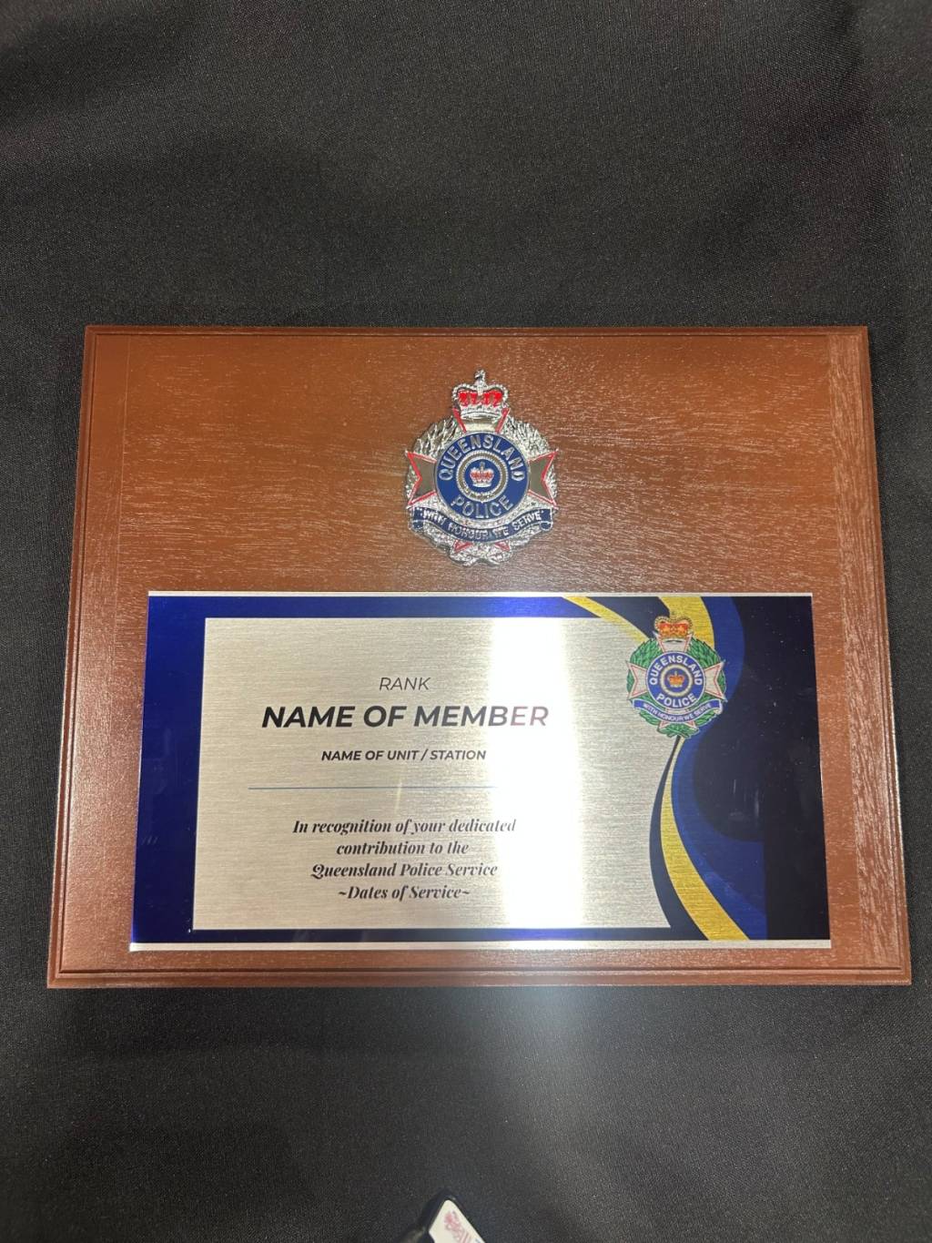 QPS badge Wooden Plaque - Large rectangle Wooden Plaque (cmxcm) with personalised script engraving or colour sublimation included